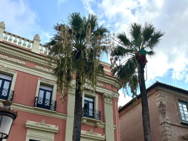 "Este equipo de operarios especializados en trepa son los encargados de subir y podar cada una de estas palmeras. Son quienes las tratan, las miman y las cuidan para poner en valor estos ejemplares que forman parte de nuestro patrimonio vegetal, de nuestro patrimonio arbóreo, pero también de nuestra cultura y nuestras raíces, ya que las palmeras es algo muy simbólico también de nuestra cultura murciana", ha explicado Guillén.