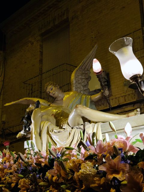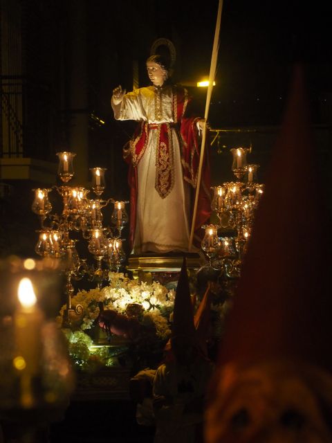 Tiene esta procesión rasgos vetustos, como los tambores destemplados que fueron tocando sin descanso tras el paso del Cristo durante todo el recorrido, o la pátina dieciochesca de los colores y las sombras que se proyectan por las estrechas calles del casco antiguo cuando la procesión se adentra en el corazón castizo del pueblo. Ostenta el orgullo de lucir uno de los Sepulcros más hermosos de la Región de Murcia. Y provoca emoción, siempre de la que sana y consuela, aunque a veces parezca imposible y nos cierre la garganta. Así ocurrió cuando del cielo cayeron este año sobre San Juan, como lágrimas, unos pétalos blancos en recuerdo de un cofrade que se ha ido con el Evangelista demasiado pronto.