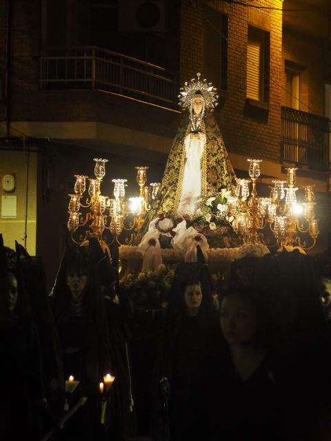 El Santo Entierro de Cristo se conmemoró la noche del pasado Viernes Santo en Beniaján, tal como lo viene haciendo desde tiempo inmemorial: sacando la pasión a la calle. Junto al Cristo de las Penas y a San Juan Evangelista, que ya tomaron parte en el desfile del Miércoles Santo, la costumbre del rito y la narración evangélica hacen que a esta procesión se unan el Señor de la Buena Muerte y Nuestra Señora de la Soledad. Un Jesús yacente y una Madre envuelta en luto. Pero ni el Señor inerte que tallara José Ortiz aparece solo sobre el frío sepulcro, puesto que lo vela un ángel lleno de fortaleza que despliega sus alas sobre el trono; ni se diría de la Virgen que camina sola, sumida en su duelo, pues parece que la acompañe un pueblo entero.