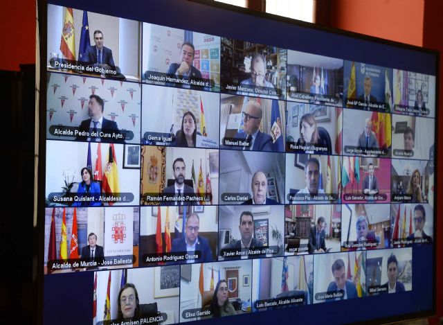 El alcalde de Murcia, José Ballesta, mantuvo una reunión esta mañana con el presidente del Gobierno, Pedro Sánchez, en la que participaron también los alcaldes de la Junta Directiva de la Federación Española de Municipios y Provincias (FEMP), con motivo de la crisis sanitaria y socioeconómica generada por la pandemia mundial del COVID-19.