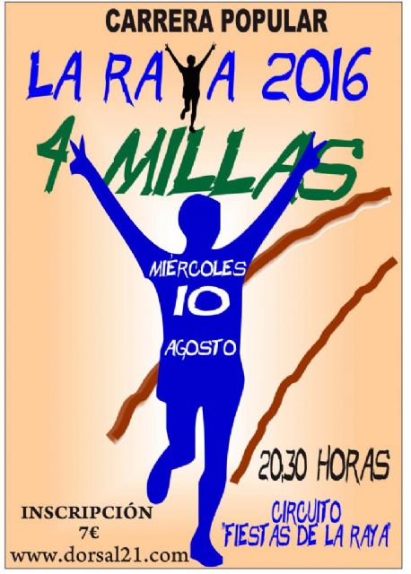 La Comisión de Fiestas de La Raya y su Junta Vecinal organizan las I 4 Millas La Raya, a partir de las 20:30h. en el marco de las Fiestas en Honor a la Virgen de la Encarnación y San Roque