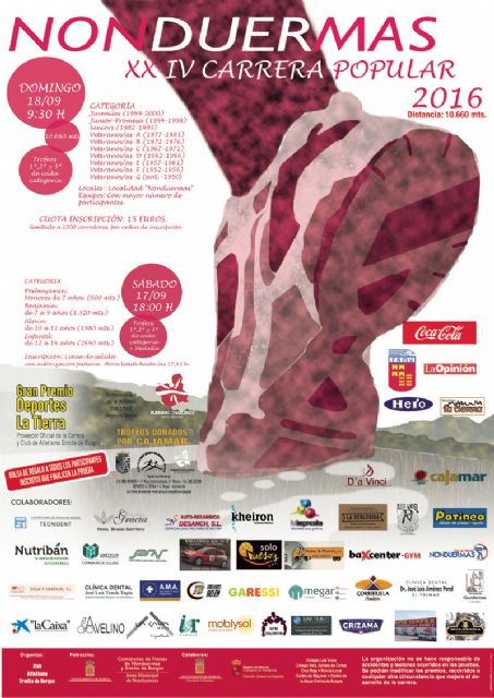 El Club de Atletismo Ermita de Burgos en colaboración con la Federación de Atletismo de la Región de Murcia organiza la XXIV Carrera Popular de Nonduermas, 21ª prueba del circuito de carreras populares Región de Murcia Running Challenge 2015/16