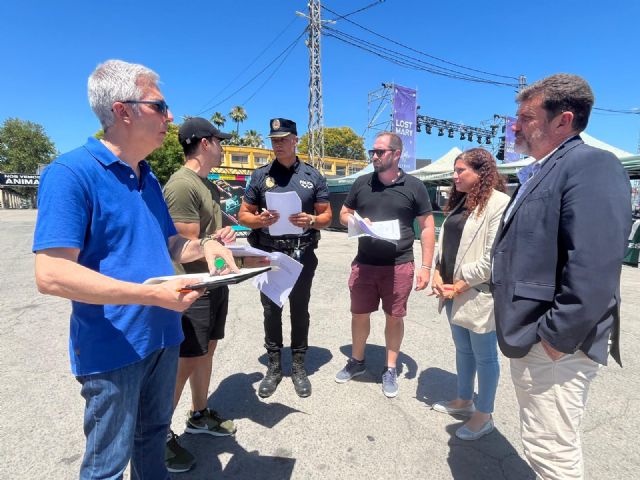 El concejal de Seguridad Ciudadana y Emergencias Fulgencio Perona y la edil de Talento Joven y Espacios Públicos, Sofía López-Briones han supervisado junto a la Policía la normativa de seguridad del recinto antes de la apertura de puertas
